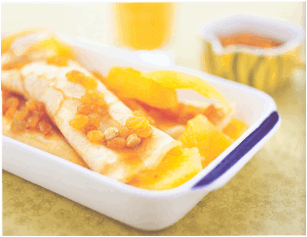 Servera antingen efterhand som crêpen blir färdiga, eller håll dem varma och lägg upp på ett fat ihoprullade med russinen i. Slå lite honung över och fräscha upp med citronsaften.