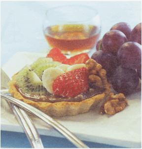 Skiva frukt och bär. Dela valnötskärnorna. Garnera formarna med alltsammans strax före servering.