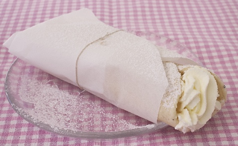 Vispa grädden. Riv mandelmassan grovt och blanda med ca 1,5 dl mjölk. Bred ut mandelmassan i en tjock sträng i mitten av wrapsen. Spritsa ut grädden i ett tjockt lager. Vik in botten först, vik sedan in sidorna så det blir en wrap. Pudra över med florsocker. Slå in i bakplåtspapper och knyt ett snöre runt wrapen.