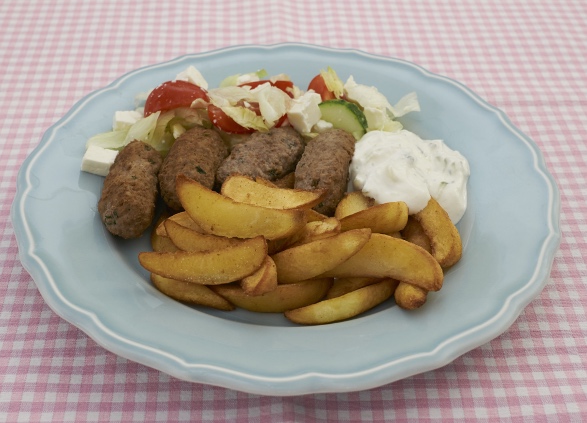 Saftiga köttfärsbiffar med smak av fetaost, persilja, vitlök och oregano. Serveras med klyftpotatis, fetaostsallad och tzatziki.