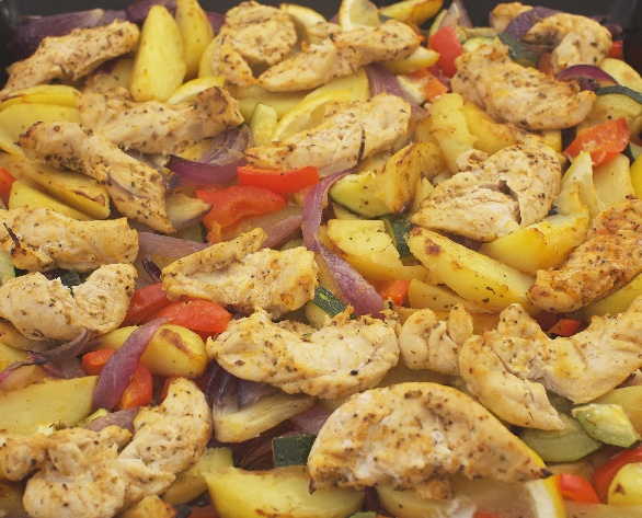 Blanda grönsakerna med potatisen. Salta och peppra. Lägg kycklingfiléerna på potatis och grönsakerna. Stek ytterligare 20-25 min.