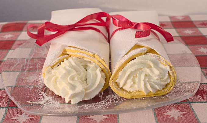 Vispa grädden. Riv mandelmassan grovt och blanda med ca 1,5 dl mjölk. Bred ut mandelmassan i en tjock sträng i mitten av wrapsen. Spritsa ut grädden i ett tjockt lager. Vik in botten först, vik sedan in sidorna så det blir en wrap. Pudra över med florsocker. Slå in i bakplåtspapper och knyt ett snöre runt wrapen.