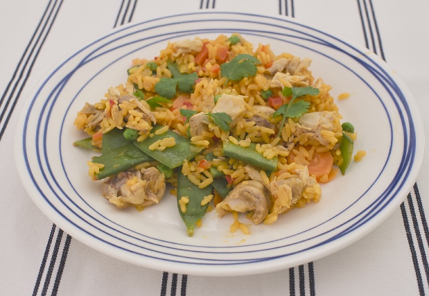 Skär gul lök och paprika i småbitar. Värm matolja i en medelstor kastrull. Stek grönsakshacket ca 5 min. Tillsätt ris, tomatpuré, smulad kycklingbuljong och Sazón Goya con azafrán. Fräs ca 2 min. Tillsätt kycklingfonden och låt riset koka på svag värme i ca 20 min. Skala och skivas morötter. Halvera sockerärtorna. Koka morötterna och sockerärtor med lock och inte under en längre stund än nödvändigt. Blanda i gröna ärtorna mot slutet för att de skall bli varma. Blanda ihop ris, kyckling, morötter, sockerärtor, gröna ärtor och finhackad koriander. Servera med en grönsallad.